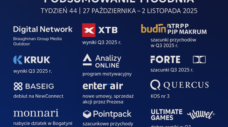 Kruk w trzecim kwartale 2025 r. osiągnął bardzo dobre wyniki – zysk netto wyniósł 292,6 mln zł (+9% vs konsensus), a EBITDA gotówkowa rekordowe 707 mln zł (+13% r/r). Po dziewięciu miesiącach spółka zrealizowała ponad 80% wyniku netto z całego 2024 r., przy silnym wzroście spłat z portfeli (+12% r/r) i ROE na poziomie 20%. Najmocniejsze dynamiki notują Włochy i Rumunia, podczas gdy Hiszpania stabilizuje się po wcześniejszych problemach. Kruk utrzymuje umiarkowane zadłużenie (dług netto/EBITDA got. 2,6x), intensywnie inwestuje w transformację cyfrową i planuje inwestycje rzędu 2,4–2,5 mld zł w 2025 r., co pozwala oczekiwać rekordowego roku pod względem zysków i przepływów gotówkowych.