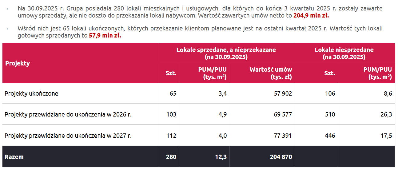 Jak widać w powyższej tabeli, na 2026 rok grupa ma sprzedane 103 lokale o wartości 69 mln zł, natomiast do sprzedaży pozostaje 510 lokali (oraz 106 lokali w projektach ukończonych). Oprócz powyższego, w przygotowaniu do rozpoczęcia inwestycji znajduje się ponad 2,3 tys. lokali.