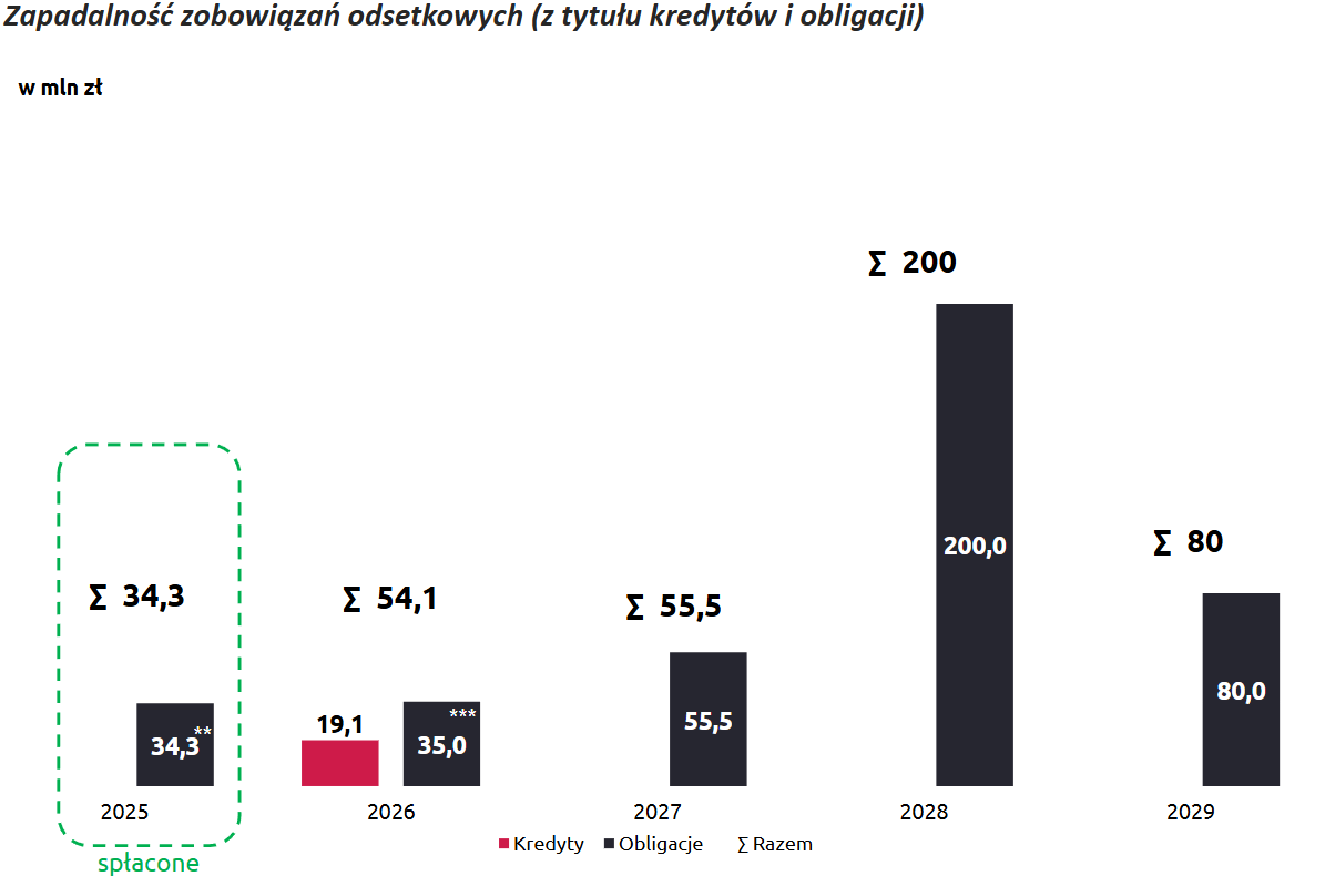 Będąc przy zadłużeniu, warto podkreślić, że spółka nie ma do spłaty długu w 2025 roku, a wkrótce przedterminowo wykupi dług obligacyjny zapadający w 2026 roku, zatem na dłuższy czas (w praktyce do 2028 roku) ma zapewniony komfort działalności bez martwienia się o brak płynności: